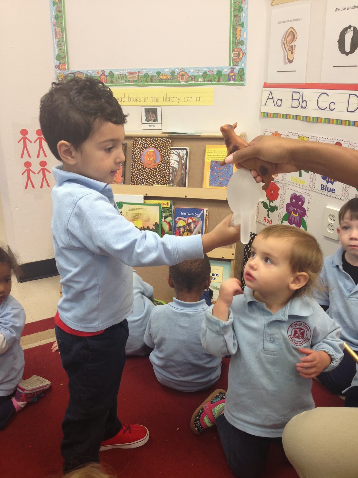 After great anticipation we finally opened our classroom pumpkins! Before we opened the pumpkins, we had a class discussion about what may be inside of them. The teachers received a plethora of responses including a spider, a baby, and a nest and bird. We implemented this activity to go along with our theme of senses to act as the touch portion and the theme. The objective of this science activity was first to encourage lanuage and thought processing (what's inside a pumpkin?) Furthermore, touching the seeds and the inside of the pumpkin encourages sensory activity.